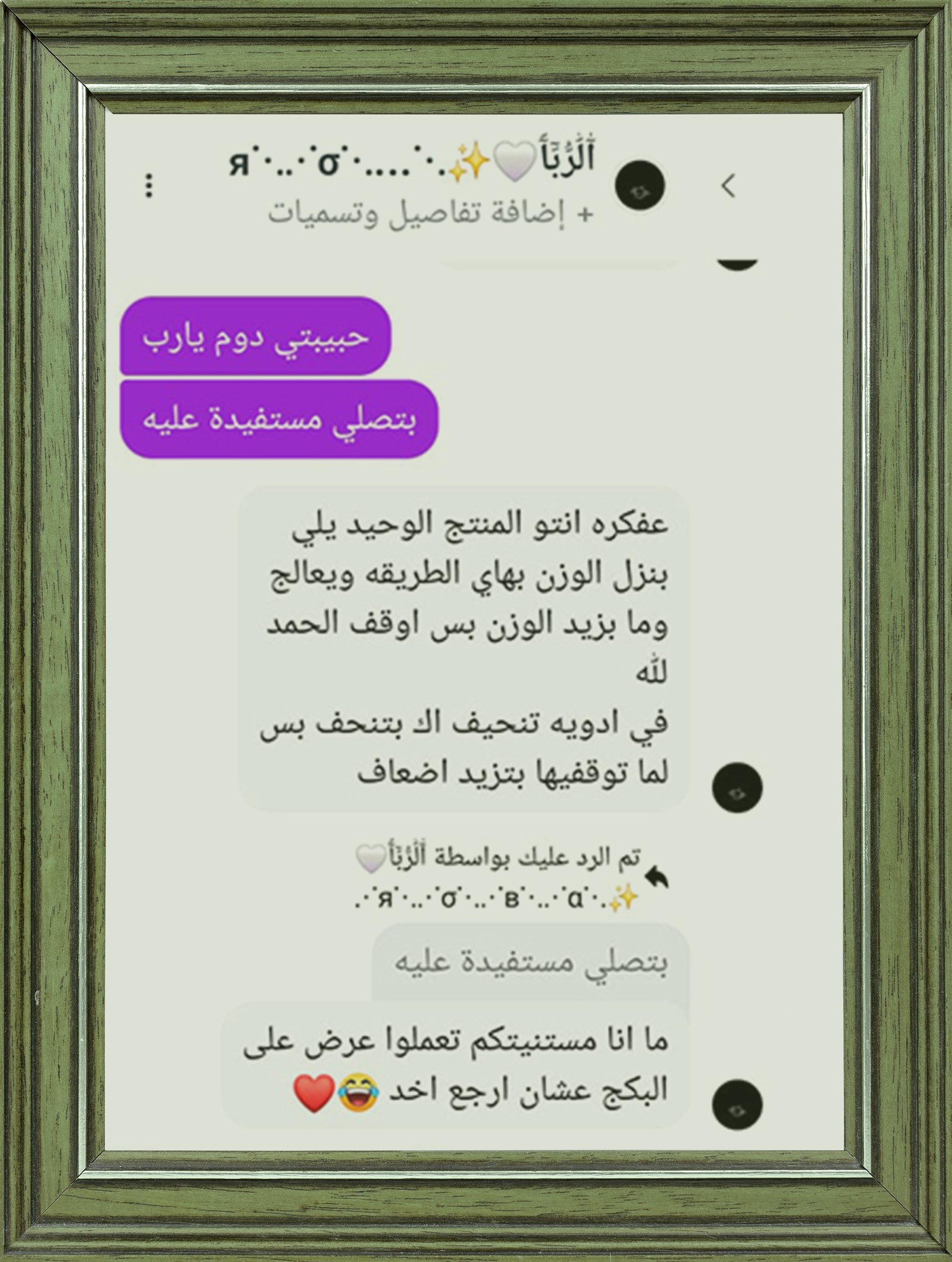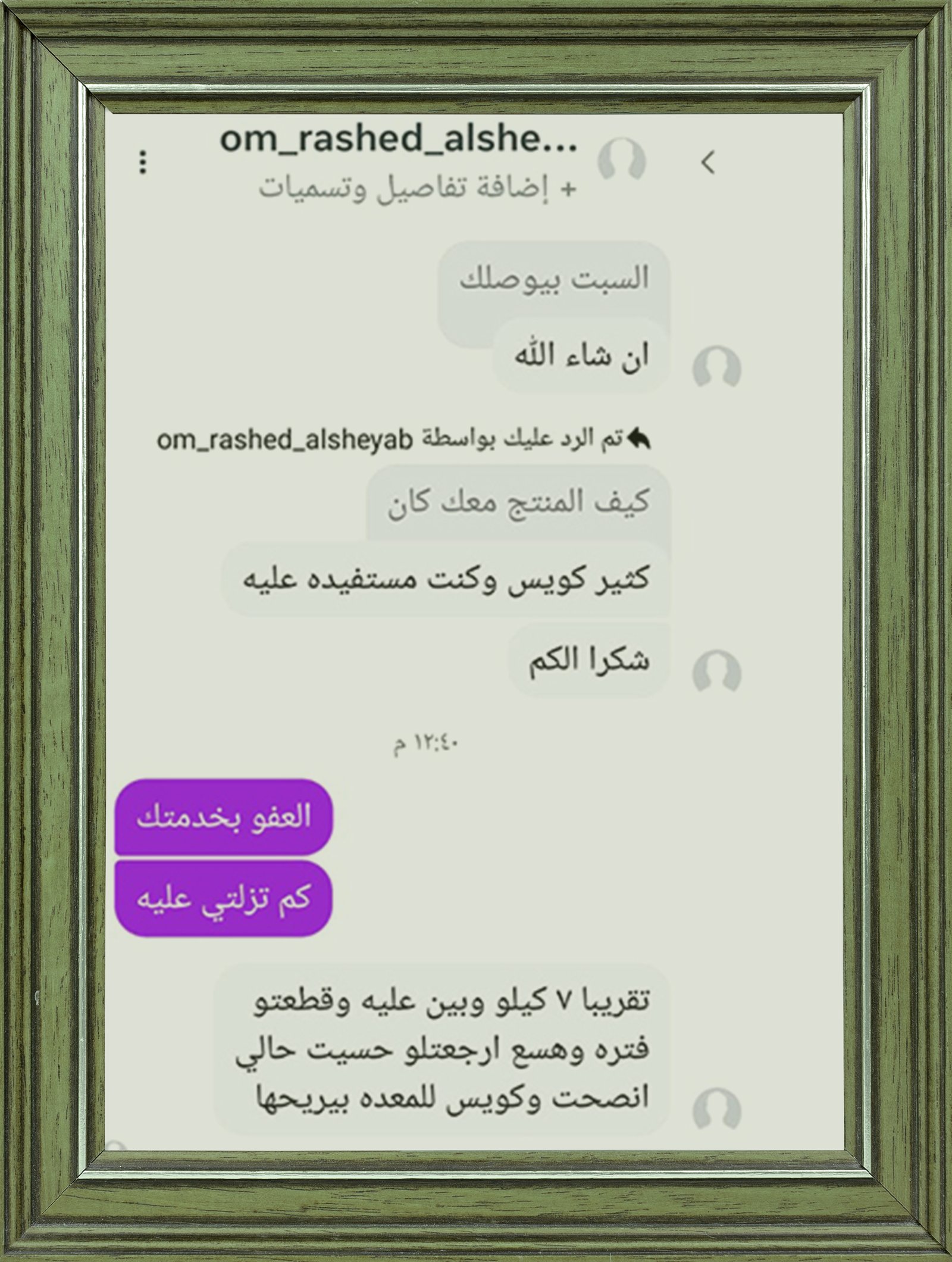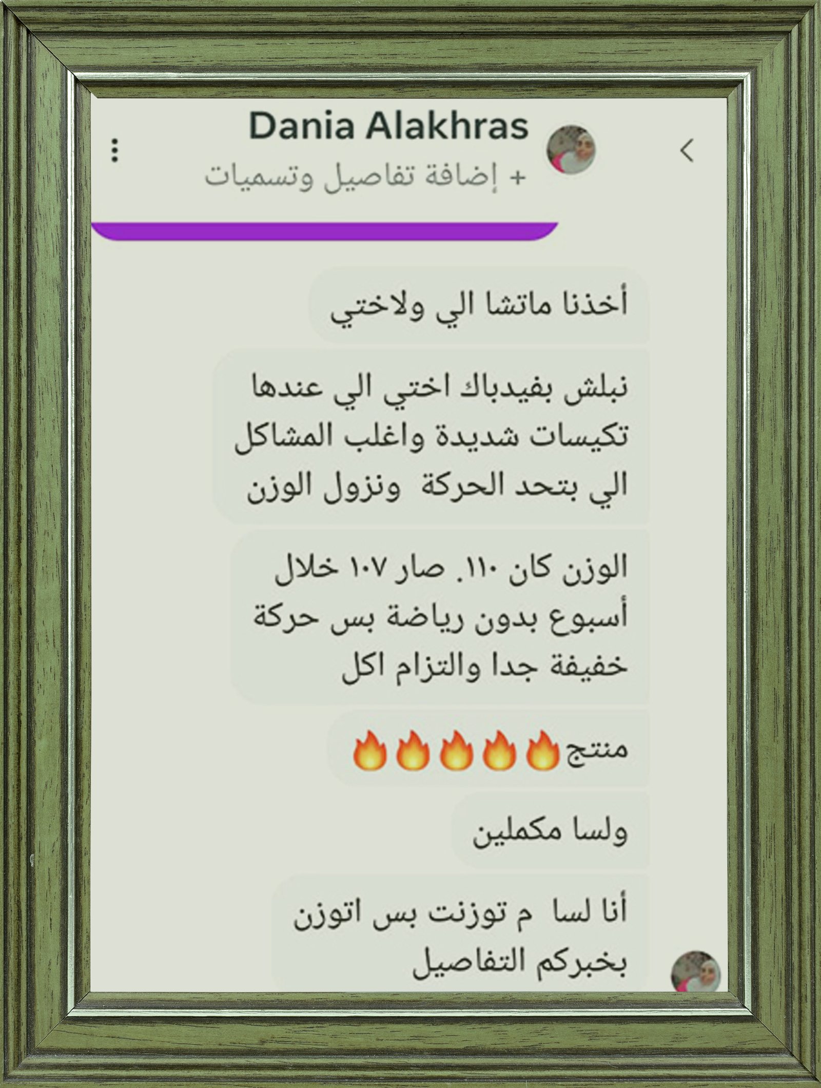 عند شراء المنتج ستتواصل معكم الدكتورة أسيل فورا التي ستتابع حالتكم وتزودكم بتوصيات تشمل نوعية الغذاء الصحي والتوصيات التي تساهم بنزول أسرع بالوزن
